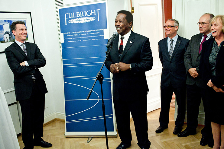 I had the distinct pleasure of giving a brief presentation on Sept. 24, 2012 at the residence of Ambassador Lee A. Feinstein (far left) to American and Polish Fulbright Grantees. Also present are Maria Orłowska, Secretary of State, Member of the Fulbright Board of Directors, Ministry of Science and Higher Education, and Jacek Nieckuła (next to her) – president of the Alumni Association. (photo by Piotr Król.)