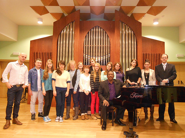 Stan Breckenridge with Robert Pluta (far right) – dyrektor Szkoły Muzycznej im. Oskara Kolberga w Radomiu; Karolina Adamczyk, Coordinator American Corner in Radom, class teacher (far left); and students.