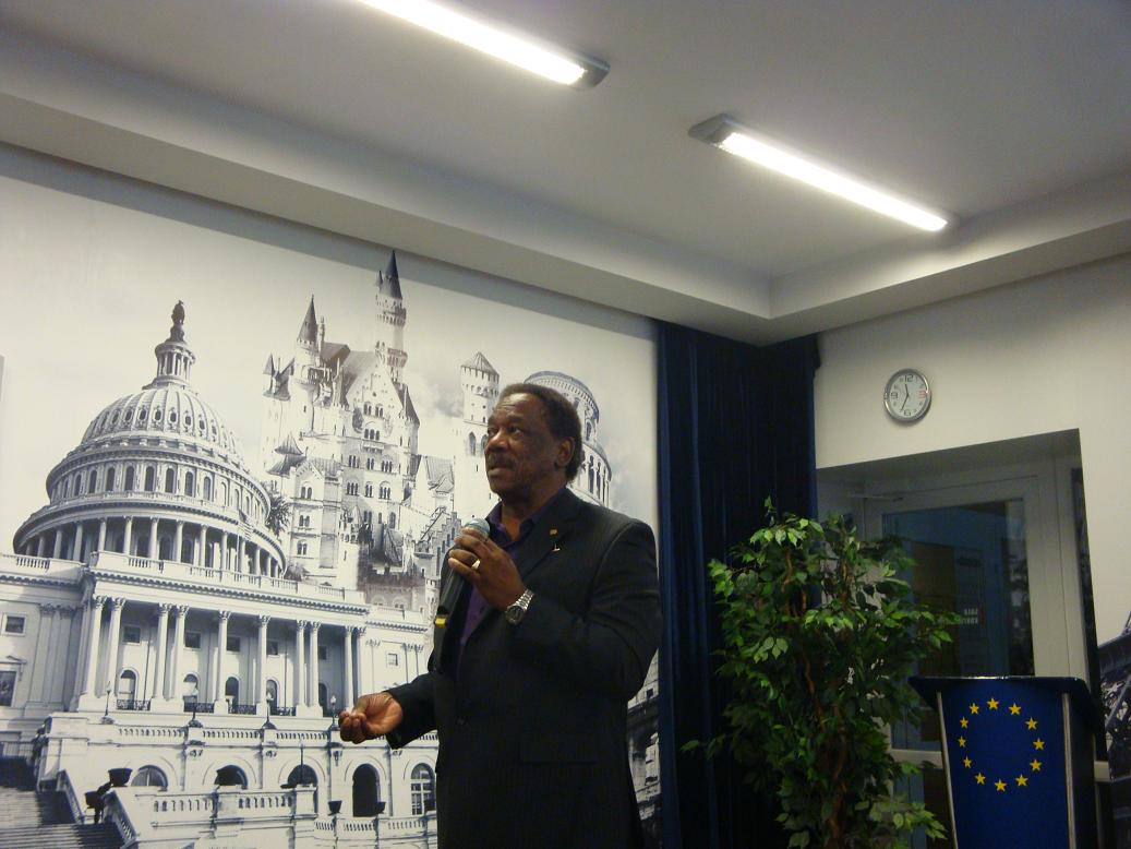 Stan Breckenridge giving a brief talk on the significance of being a Fulbright Scholar to students at the OLJ im. Unii Europejskiej w Radmiu.