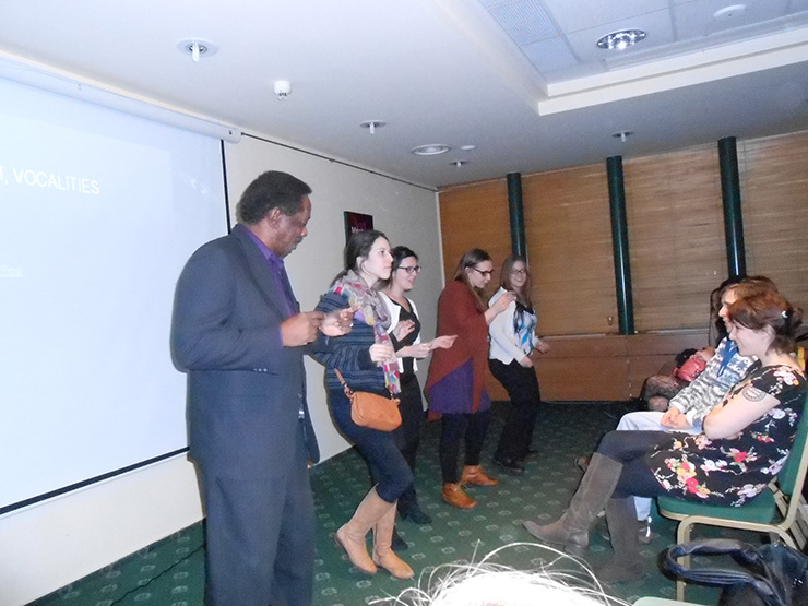 Fulbrighters are encouraged to participate b clapping various rhythms.
